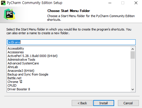 시작메뉴를 생성하는 폴더이름을 정하고 Install
