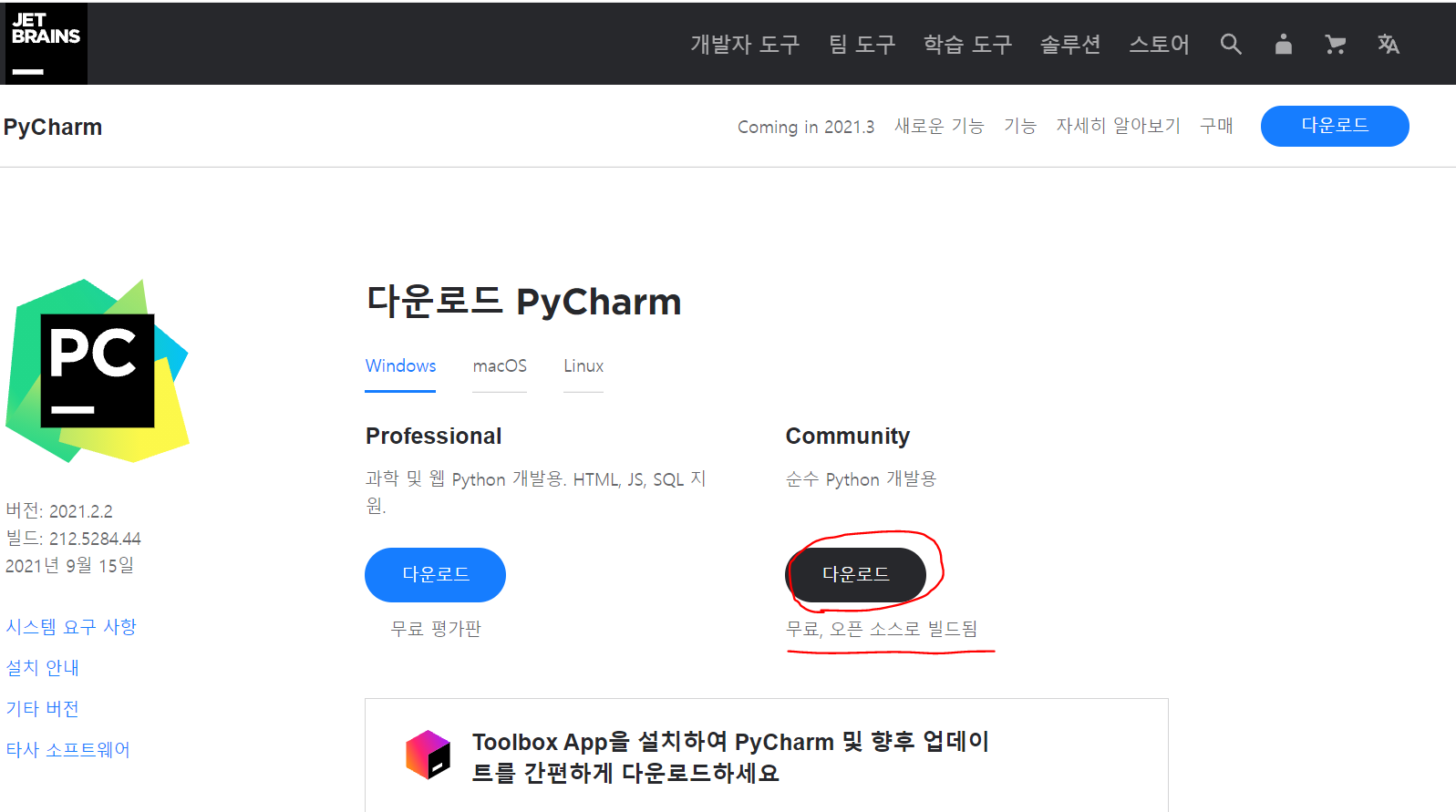 https://www.jetbrains.com/ko-kr/pycharm/download/#section=windows