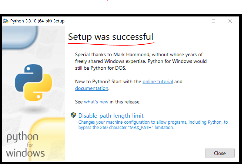 설치 완료하였습니다. 이제 파이썬을 실행하고 경로가 제대로 잡히는지 확인하면 될것같습니다.