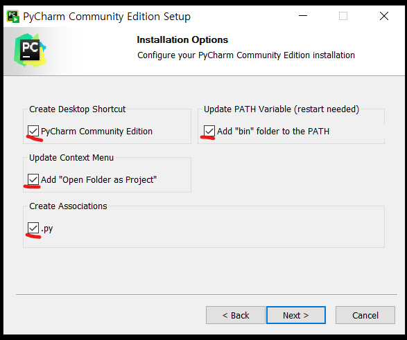 Update PATH variable (restart needed) : 명령 프롬프트에서 PyCharm에 직접 접근할 수 있도록 경로를 추가