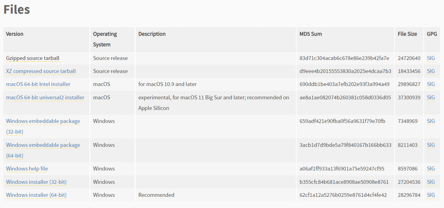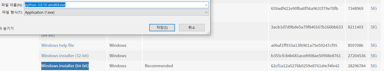 저는 현재 window 기준으로 3.8 릴리즈의 가장 최신인 3.8.10버전으로 다운받아 설치하겠습니다.