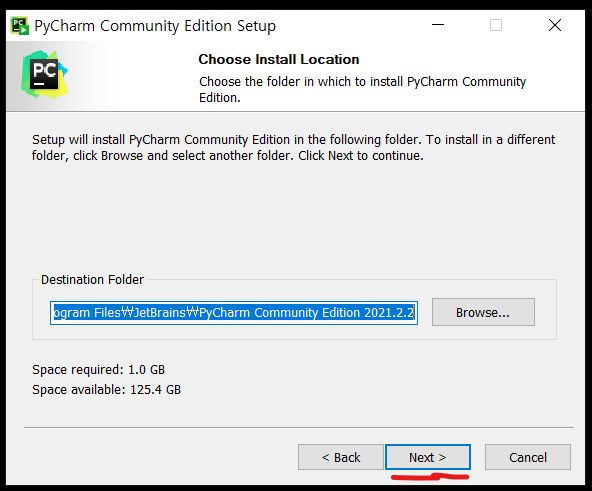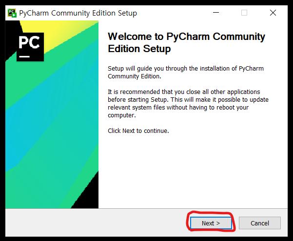Pycharm을 바로 시작하려면 PC 재부팅후 Pycharm을 실행하시면 됩니다.