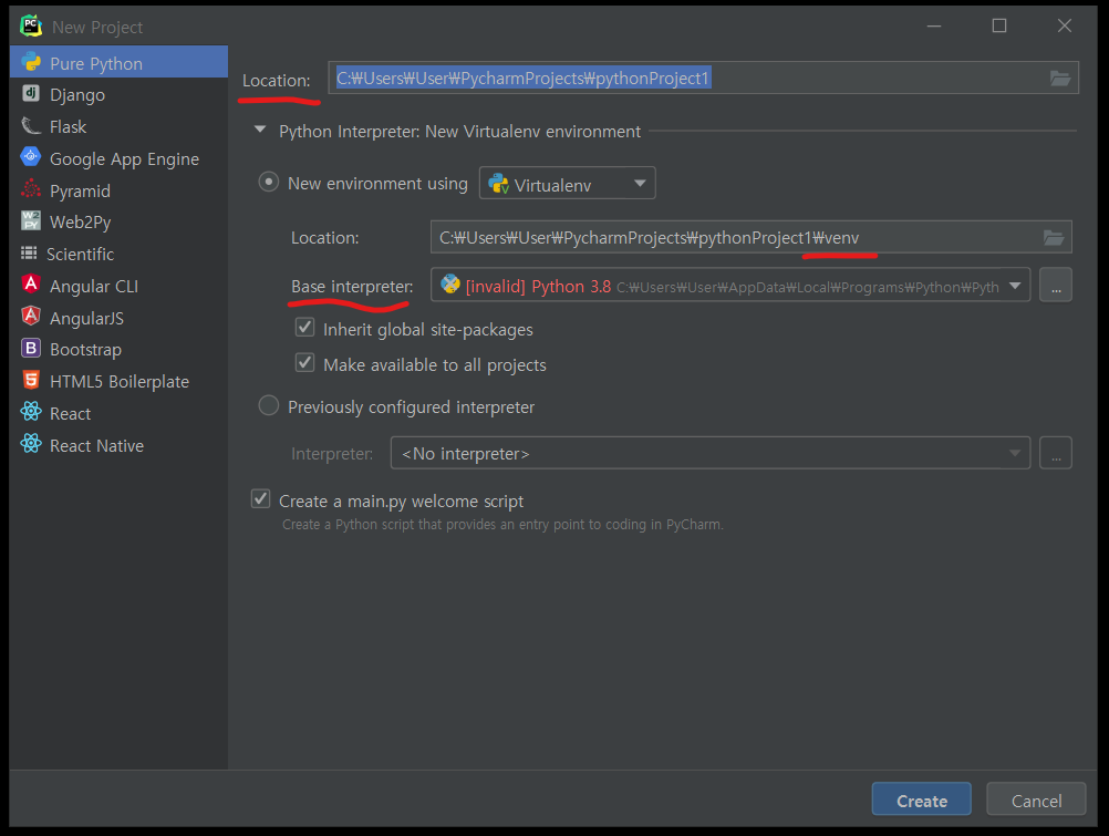 3. Base interpreter는 설치한 파이참과 파이썬exe파일을 연결시켜준다고 생각하면됩니다.